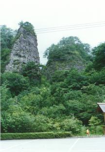 古岩屋 愛媛県上浮穴郡久万町(93/7/30) 高さ数十mの礫岩峰が林立するすごい景観の所でした。写真は広角のカメラを持っていないために、上まで撮せた比較的背の低いものですが、このような礫岩峰が見えるだけで数十本、探勝路もあるようでしたが、時間の関係で行けませんでした。
