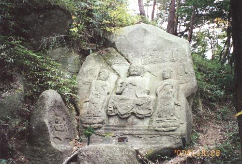 狛坂磨崖仏 滋賀県栗太郡栗東町(2000/11/12) 金勝山西麓にある狛坂寺跡に残る阿弥陀三尊、他の磨崖仏です。第1級の磨崖仏です。南側の桐生の辻と言う所から登りましたが、第2名神の工事中のために遊歩道はガタガタ、工事が済むまでは上桐生と言うところから登るか、金勝山の林道を利用して下った方がいいでしょう。 田上山、金勝山一帯は奈良時代からの森林伐採で禿げ山になり、表土流失のために森林が再生せず、1000年以上にわたって禿げ山状態が続き、周囲に土砂を流失し続け、天井川など治水上好ましからざる状況を作り出してしまったそうです。自然破壊の恐ろしさの見本のような山です。現在は、明治以来営々と、1000年来の付けを払うべく、砂防工事を続け、山を取り巻くような形で石垣を巡らし、小さな平地を作って、植林し、遠目には普通の山のように木が生えています。この石垣の規模の大きさを見ると、自然保護の大切さ、自然破壊の回復の難しさが実感できると思います。
