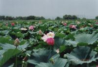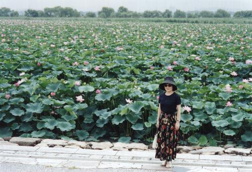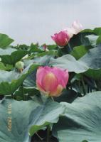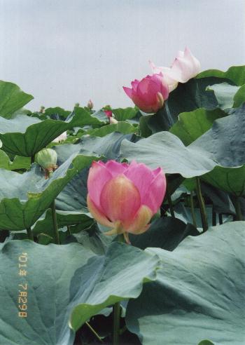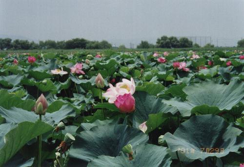 琵琶湖岸の蓮 滋賀県草津市(2001/7/29) 滋賀県草津市の琵琶湖岸の入り江に見られる蓮の群生地です。湖岸と烏丸半島との間の水域がほぼ蓮で埋め尽くされています。湖岸道路側の岸と草津市水生植物公園みずの森から見ました。日陰があるわけてもないのに、湖岸道路側は半分ぐらいがつぼみでしたが、公園側は一部の花は終わりながらもこれから咲こうとしているつぼみもある状態でした。とにかく綺麗でした。 v(^o^)v パンフレットには日本一の蓮群生地との案内があり、多分そうなんだと思います。 ここの蓮は平成28年に突然ほぼ無くなってしまいました。大きな観光資源だったので、平成30年の時点で復活を試みている状態のようです。留学生が来るとドライブに連れて行く定番としていたのですが、無くなって以来行っていません。隣に蓮をテーマの一つとしている草津市立水生植物公園みずの森があるので、蓮関連の観光地としては無くなっていないかと思います。 | |||
