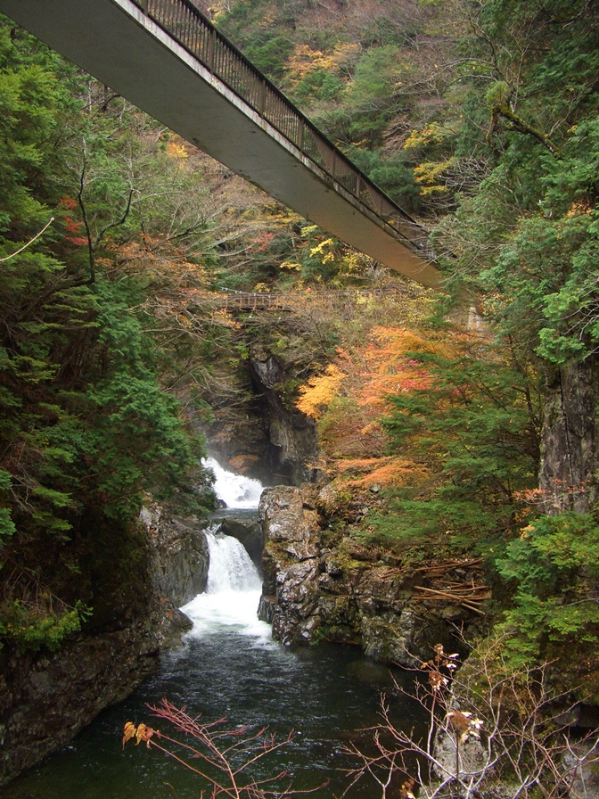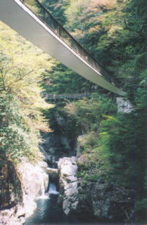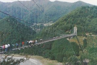 谷瀬の吊り橋 奈良県十津川村(90/11/3) 国道168号沿いの十津川にかかる長さ297mの鉄線の吊り橋。この写真でも分かる通り観光客がたくさん訪れます。最近の新聞によるとそのため地元の小学生は通学路として使うことを止め、スクールバス通学になったそうです。