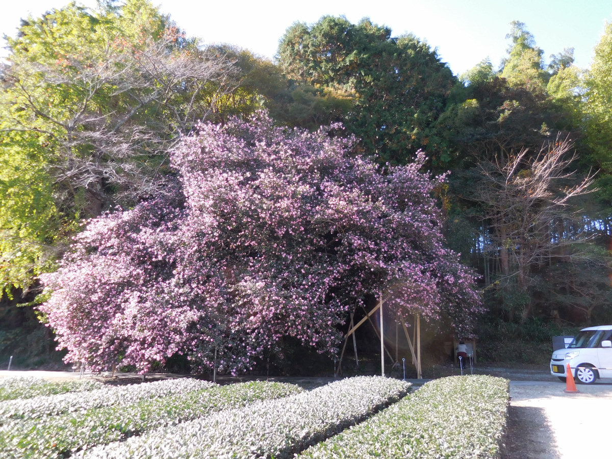 三重県松阪市飯南町粥見にあるサザンカの大木で、個人の茶畑の傍らにあり、市指定の天然記念物になっています。3分咲き程度でしたが、ご覧のように十分綺麗でした。v(^O^)v 満開の頃にはすごく綺麗だと思います。 |
