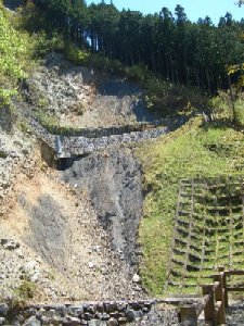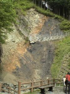 西日本全体を南北に分ける大断層の中央構造線の露頭です。2004年春に露頭を見難くしている土を取り除いて見やすくしたと新聞にありましたので、昔からここにあるのは知っていましたが、今まで出かける機会がなく初めて行きました。国道166号線から旧道に入って、北奥林道という林道を15分ほど車で行った所に車を置いて、徒歩500mです。津の自宅から83km程の所です。上の地図へのリンクで出てくるところは谷川の位置になっていますが、露頭は谷川の東側、見学のための公園は谷川の西側にあり、地図にはありませんが、林道も谷川の西側にあります。