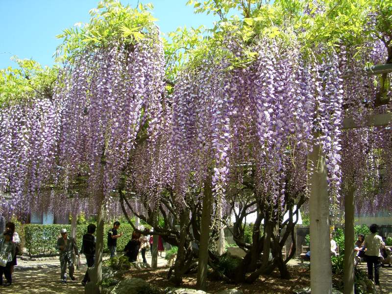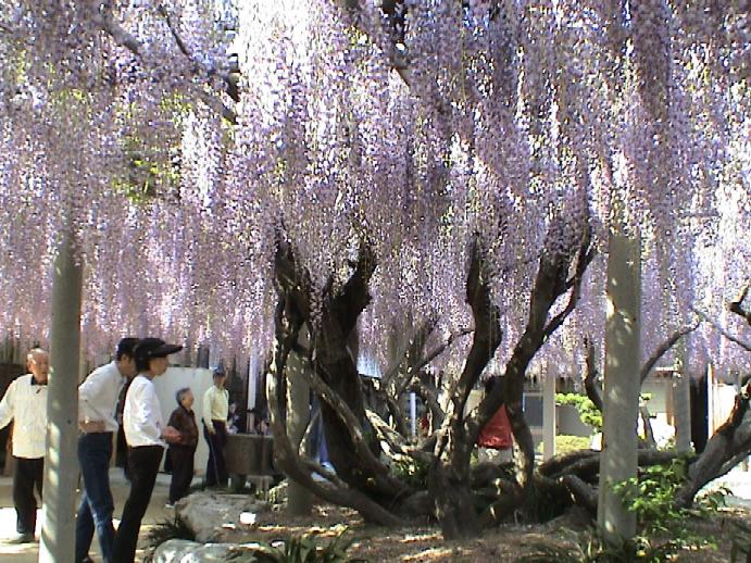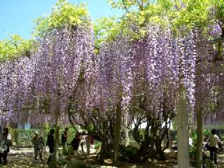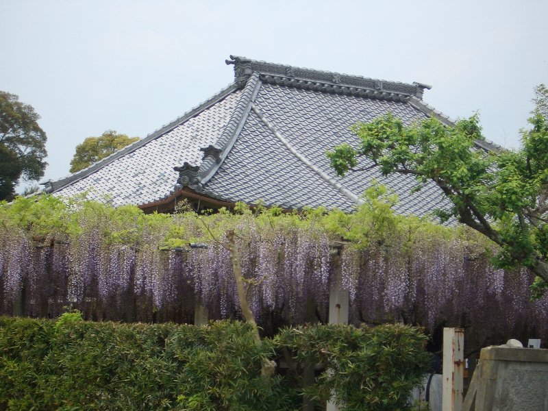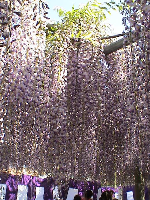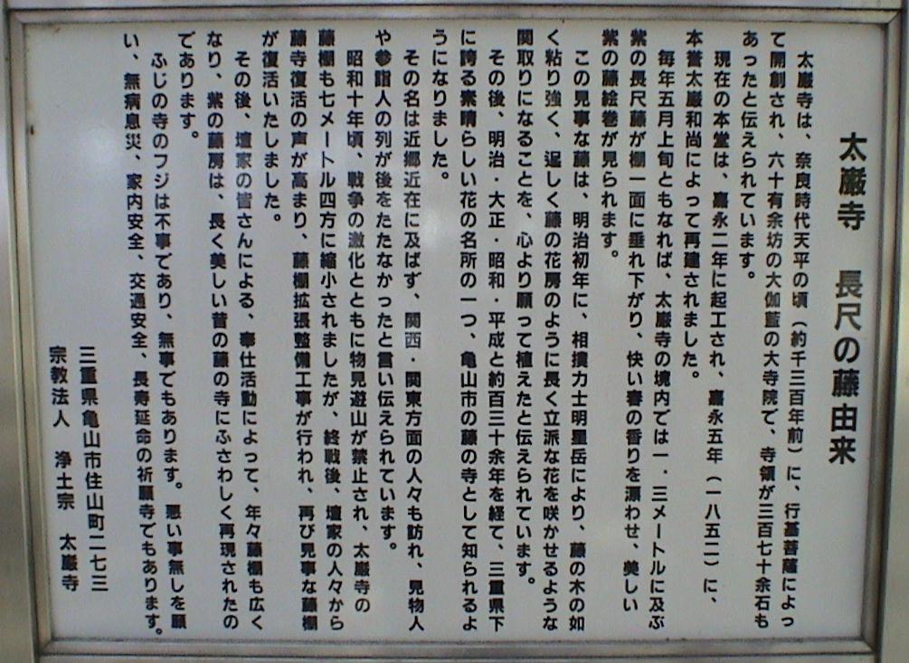 三重県亀山市北西郊外にある太厳寺にある藤です。約200m2の藤棚にある長尺藤です。ほぼ満開の時に行けて、私が行った中では最高の藤棚でした。(最も、藤についてはなかなか花のピッタシの時期に行けたところがなかっただけかもしれませんが、(^_^;) 花の房は写真を見ても分かるように1mはあって、長いものは1.5m近いのではないかと思いました。 太厳寺と長尺藤の由来については看板をご覧下さい。